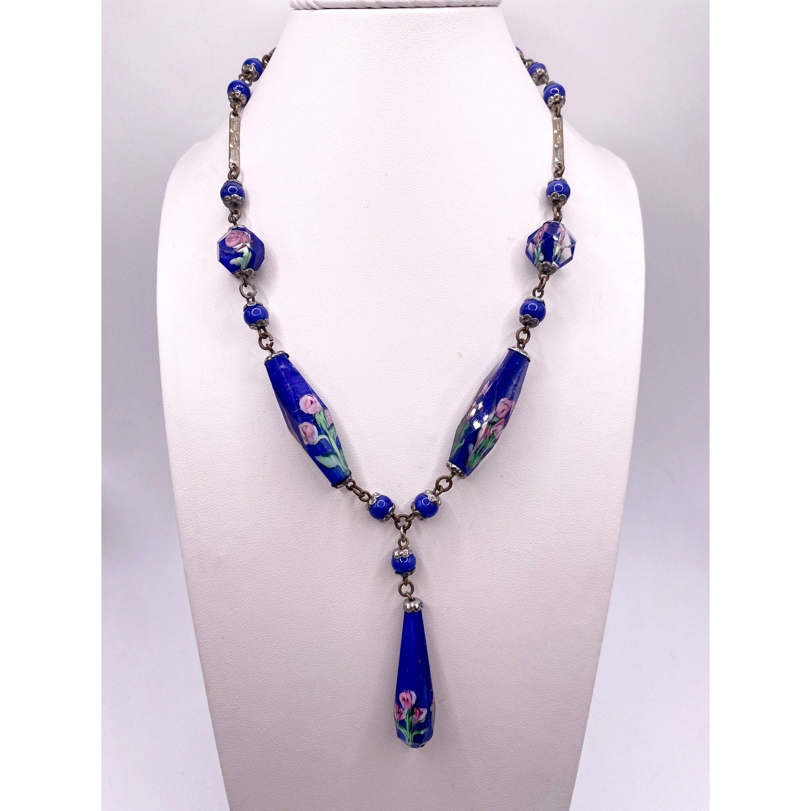 This Antique Czech Cobalt Blue Glass Bead Necklace from the 1930s Art Deco era showcases exquisite craftsmanship and timeless elegance. The deep cobalt blue beads are hand-cut and individually knotted, featuring delicate metal filigree findings with mild tarnish that adds authentic antique character. Perfect for collectors or vintage jewelry lovers, this piece captures the charm of early Czech glass artistry.