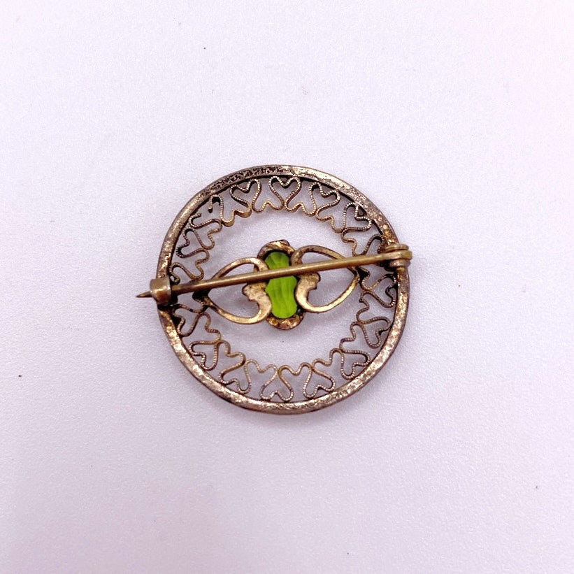 Antique Edwardian Era Brass filigree Small Brooch With Bohemian Green Glass Stone