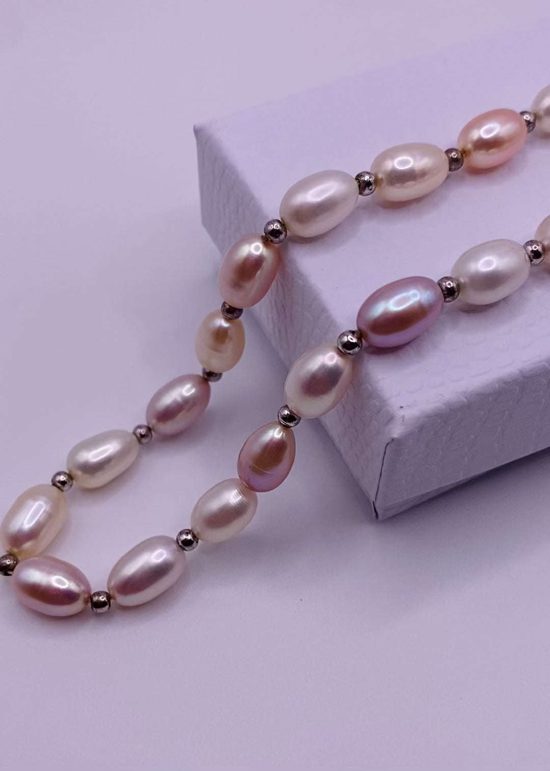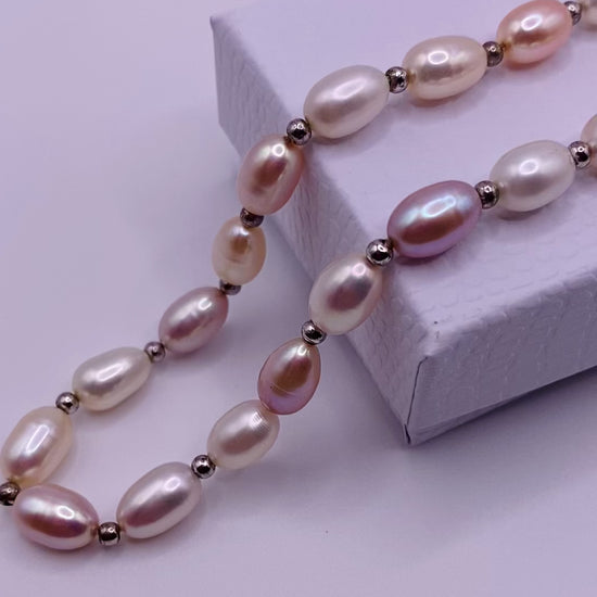 Beautiful Vintage freshwater pearls Necklace, with Sterling silver closure and sterling silver beads, it is 16 inches long and 1cm long pearls, it does have a missing silver bead but overall in great condition. has a beautiful pink shine at light, it is previously owned but in Excellent condition. it ill be shipped on a necklace box. Enjoy this magnificent valuable pearl necklace!