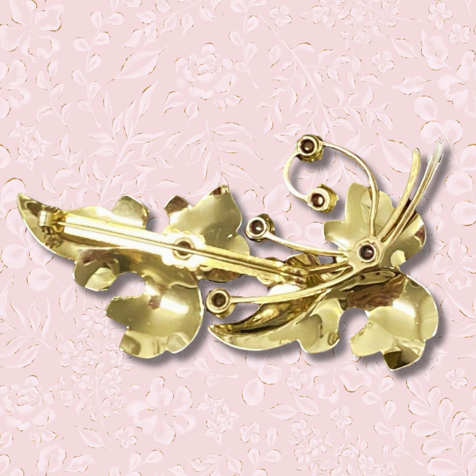featuring leaves and pink cat eye stones. It looks like new, light in weight, the gold shine is beautiful, no scratches, no damage. It would make an stunning and delicate touch to anyone's outfit!