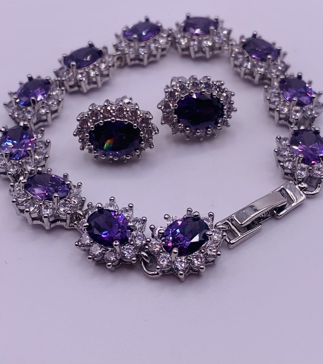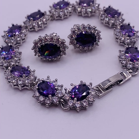 High Quality Rhodium and Silver Plated Bracelet and Studs Earrings-Lab Amethyst