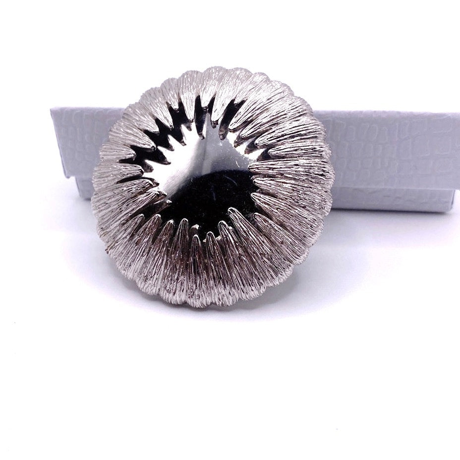 This Monet Signed Large Starburst Sun Brooch from 1965 is a striking example of mid-20th-century costume jewelry. Featuring a mirrored starburst design, this celestial-inspired brooch radiates vintage glamour and bold statement appeal. Its intricate rays and reflective surfaces make it a standout accessory for any outfit, while the signed Monet mark ensures authenticity and collectible value.