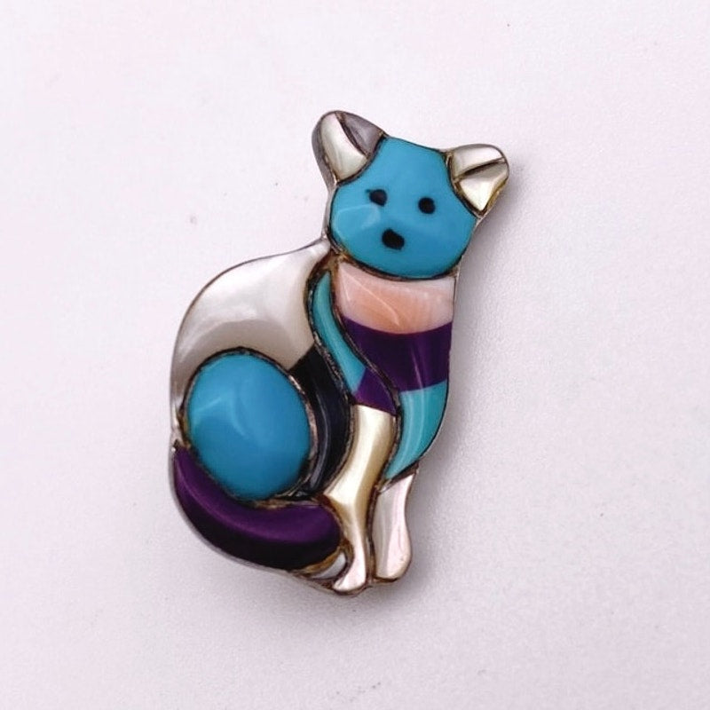 This charming Native American Western-style sterling silver cat brooch from the 1970s showcases exquisite craftsmanship and delicate gemstone inlay work. The cat motif is beautifully detailed, featuring vivid inlaid gemstones that highlight its playful character. Despite its small size, this brooch makes a big statement with its artistry and heritage-inspired design.