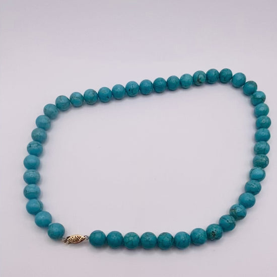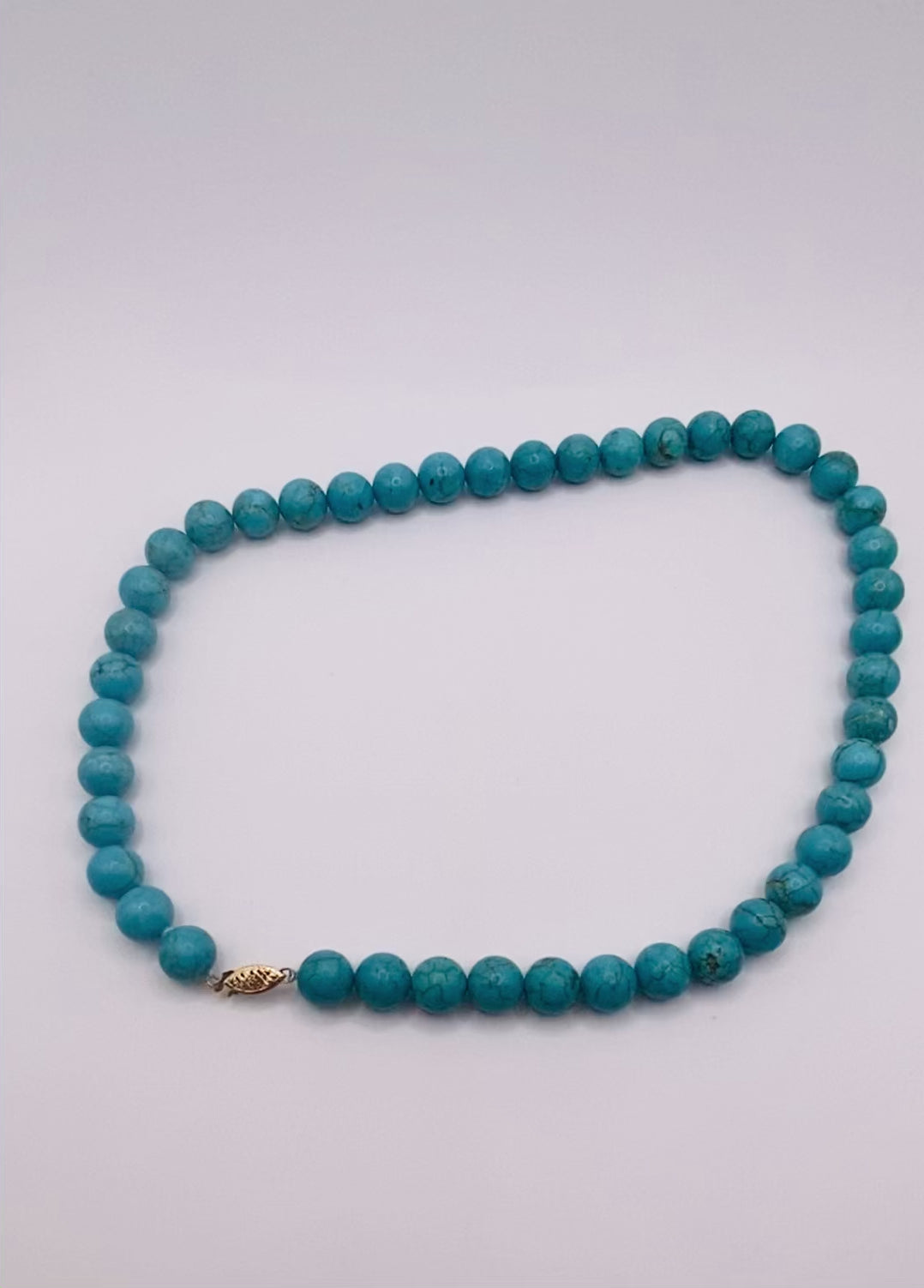This vintage turquoise gemstone necklace from the 1980s features a beautiful beaded design with a 14k solid gold clasp for a luxurious finish. The natural turquoise gemstones add a timeless, earthy charm, making this piece perfect for collectors and jewelry lovers alike. Its classic mid-century style and excellent vintage condition make it a rare and elegant addition to any jewelry collection.