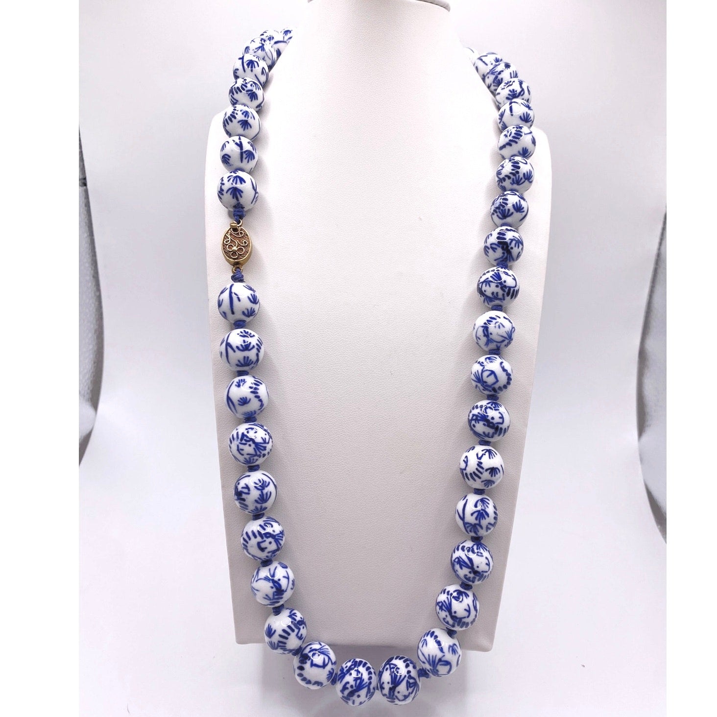 This exquisite vintage Chinese necklace features hand-painted blue and white porcelain beads, each delicately crafted with traditional motifs. Measuring 22 inches, the necklace showcases mid-century artistry and timeless elegance, perfect for collectors of fine vintage jewelry and Asian-inspired designs.