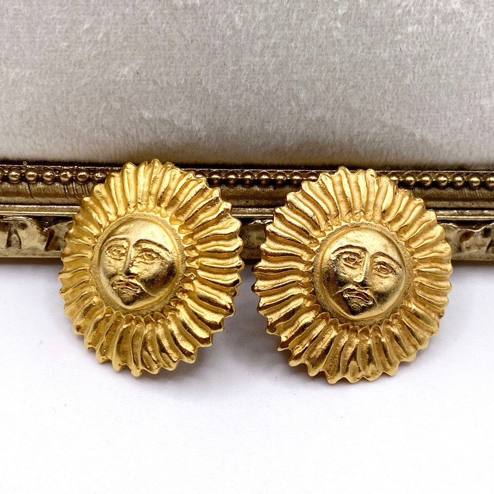 Vintage Clip On Earrings Sun Face 80s Style Gold Brushed Tone