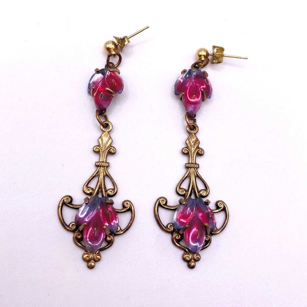 These charming vintage dangling earrings feature intricate brass filigree work adorned with pink and purple glass stones, creating a vibrant and elegant mid-century design. Measuring 2.5 inches long, the earrings showcase graceful movement and delicate craftsmanship.