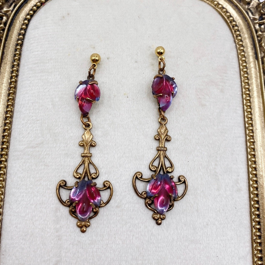 Presented in very good vintage condition, with intact filigree, vibrant glass stones, and secure earring findings. Ideal for collectors of 1950s jewelry and lovers of unique vintage glass designs.
