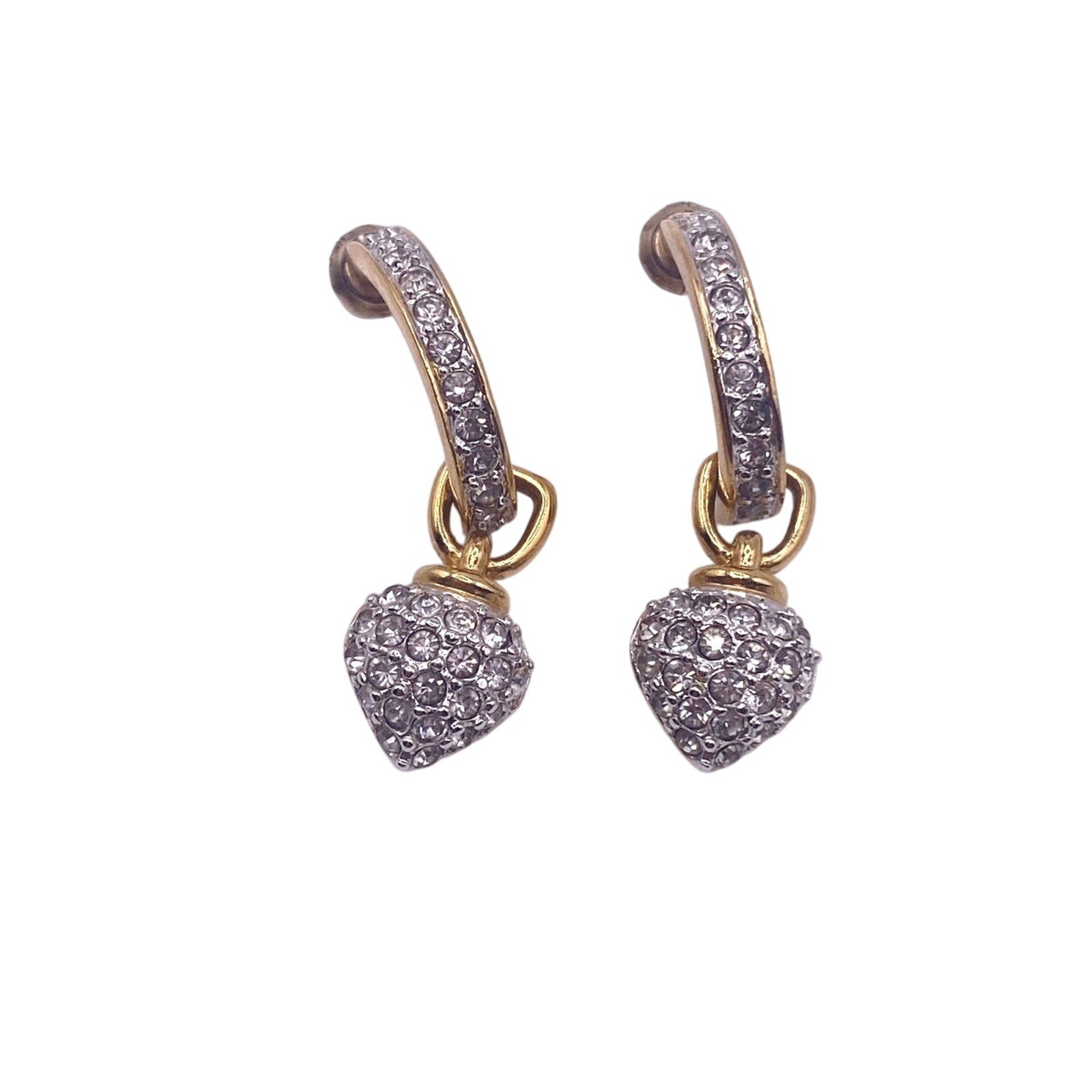 Vintage Two Tone Pave Rhinestones Heart Drop Half Hoop Studs