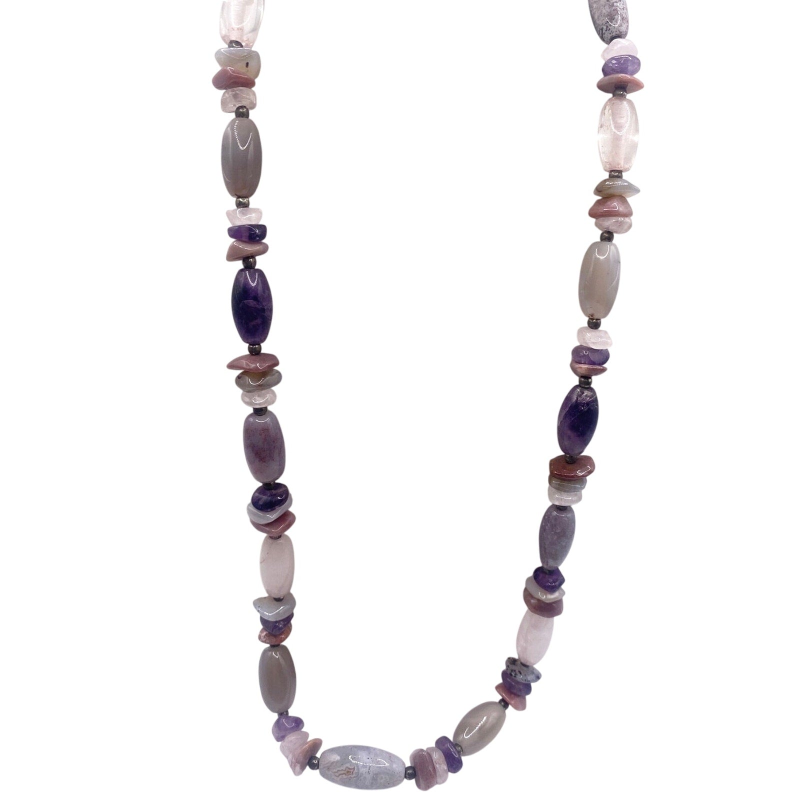 This vintage handmade necklace from 1998 showcases stunning amethyst gemstones paired with mixed polished gemstones, creating a vibrant and unique design. Each stone is beautifully polished, highlighting natural colors and textures. A timeless accessory, this necklace adds elegance and charm to any jewelry collection.