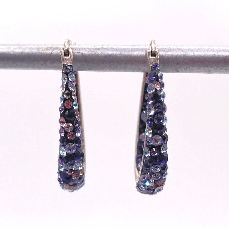 These vintage hoop earrings from 2005 feature a brass base elegantly adorned with pave-set purple crystals. The hoops offer a stylish, modern look with a touch of sparkle, perfect for everyday wear or special occasions. In very good vintage condition, these earrings are ideal for collectors or fashion enthusiasts seeking a vibrant statement piece.