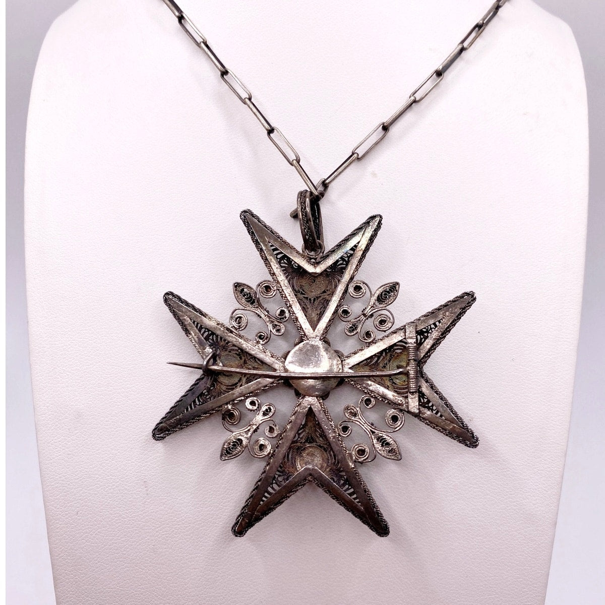 This striking vintage necklace features a beautifully crafted Maltese cross rendered in intricate, lace-like metal artwork with a silver tone finish. Suspended from a classic paper clip chain, the cross serves as both a pendant and a brooch, showcasing versatile midcentury design. Measuring approximately 2 inches, the detailed openwork highlights exceptional craftsmanship, while the 16-inch chain sits elegantly at the neckline. A rare and artistic statement piece from the 1950s.