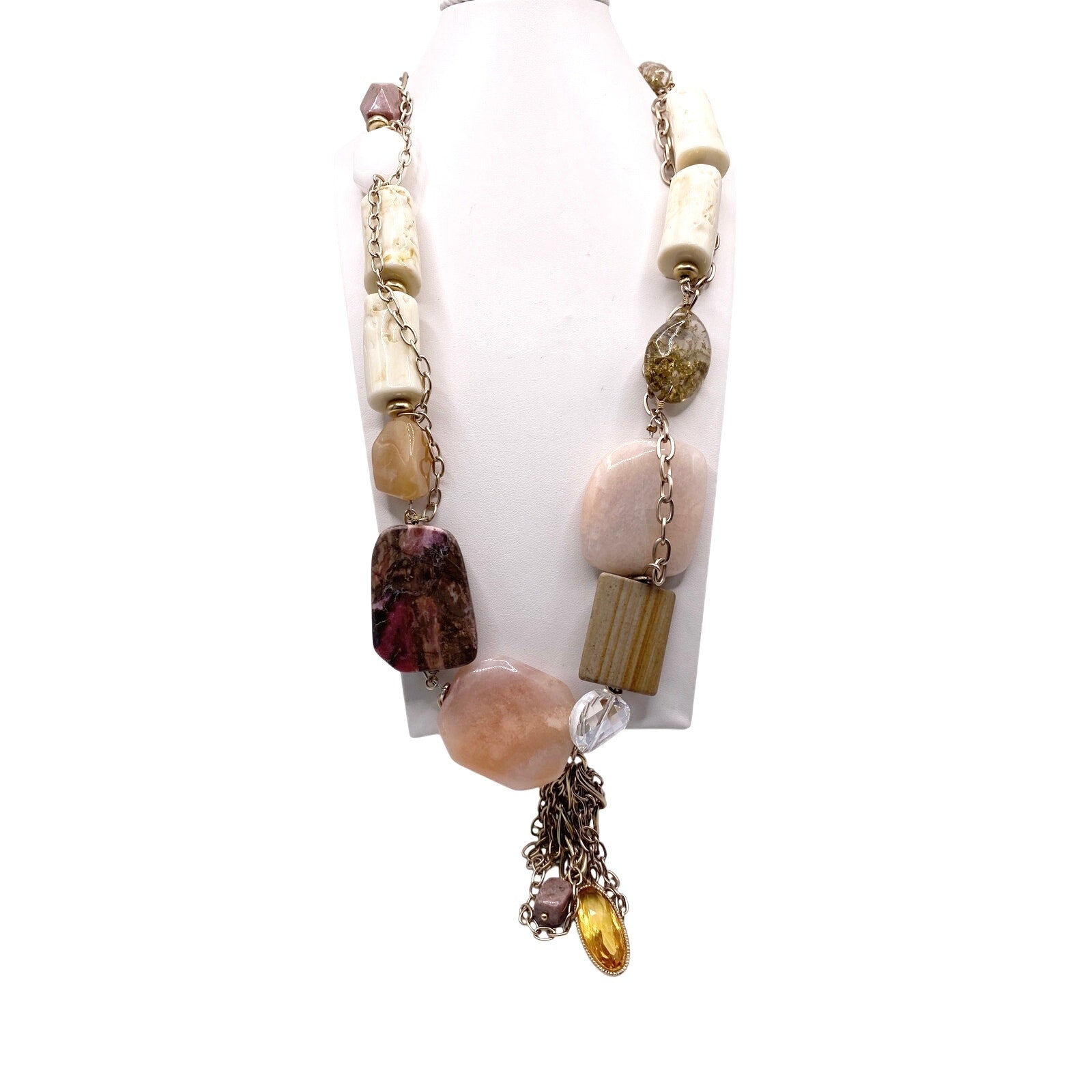 Vintage Multi Gemstones Chunky Necklace: Quartz Amber Tagua Nut and Uranium Glass Pendant 24”