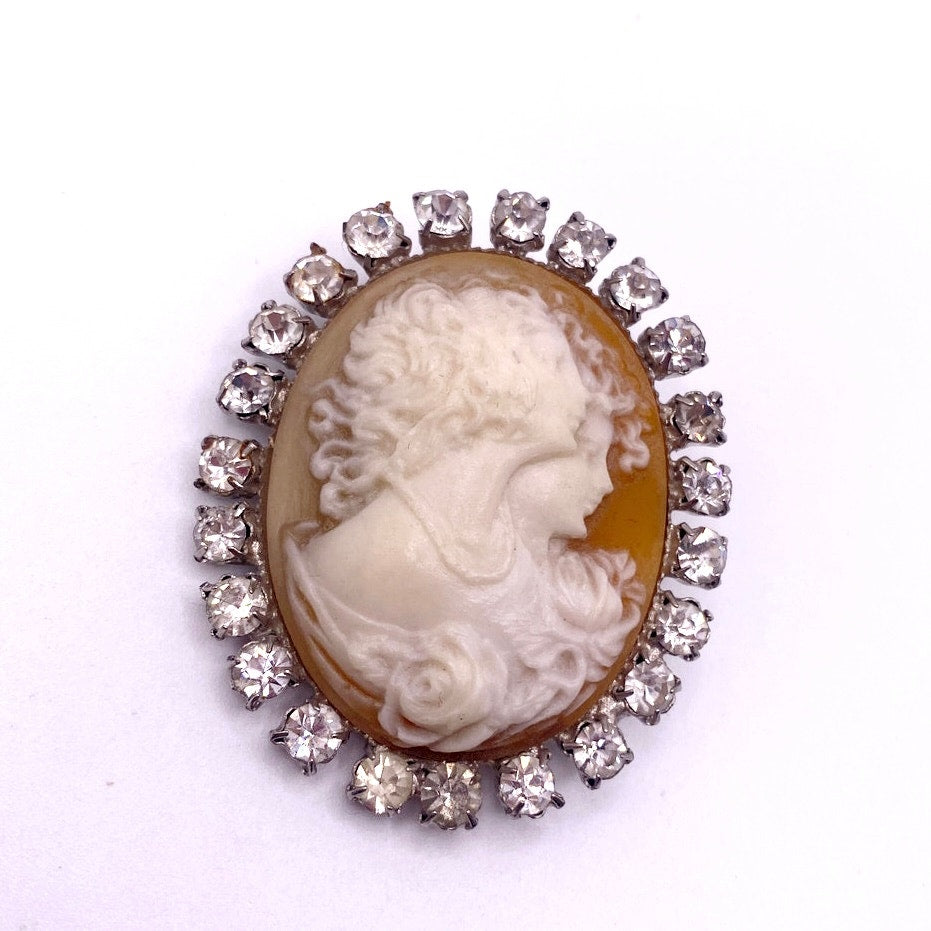 This exquisite vintage Three Graces cameo brooch captures the romantic artistry of 1950s costume jewelry. Crafted from molded resin, the detailed cameo depicts the classical Three Graces motif, accented with sparkling rhinestones that add elegant brilliance. Measuring 2 inches long, this timeless piece reflects midcentury fascination with classical themes and makes a graceful statement on any outfit.