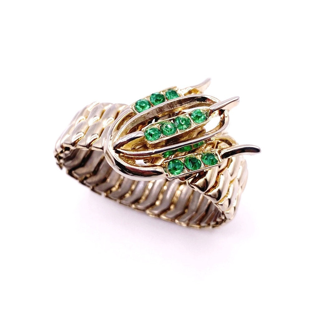 This beautiful vintage stretchy bracelet features vibrant green rhinestones set in a gold tone metal finish, showcasing classic midcentury costume jewelry craftsmanship. Made in Japan during the post-war era, this bracelet reflects the charm and quality of occupied Japan jewelry produced between 1945 and the early 1950s. The flexible stretch design allows for comfortable wear while maintaining a bold, eye-catching look.