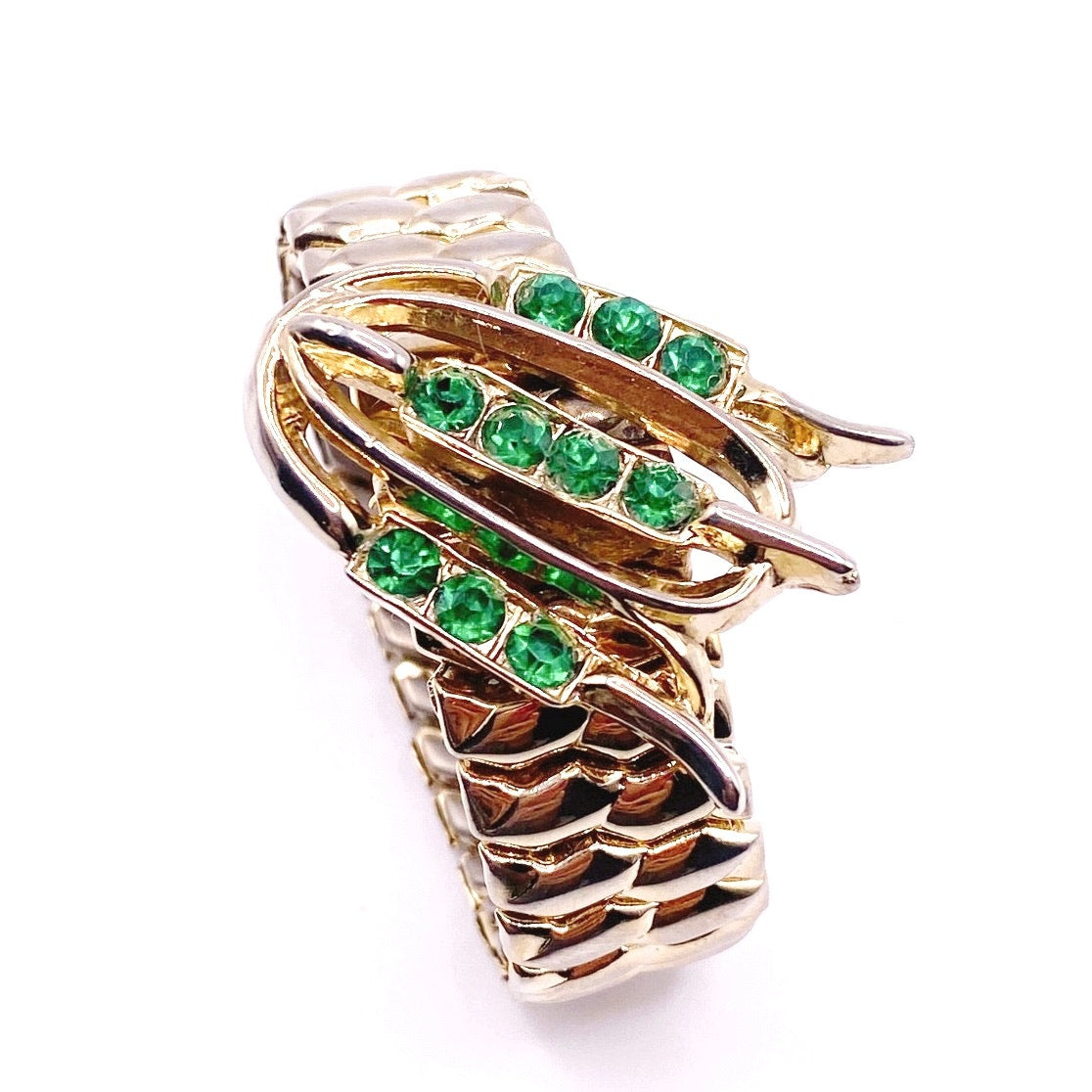 Green rhinestone accents with gold tone setting