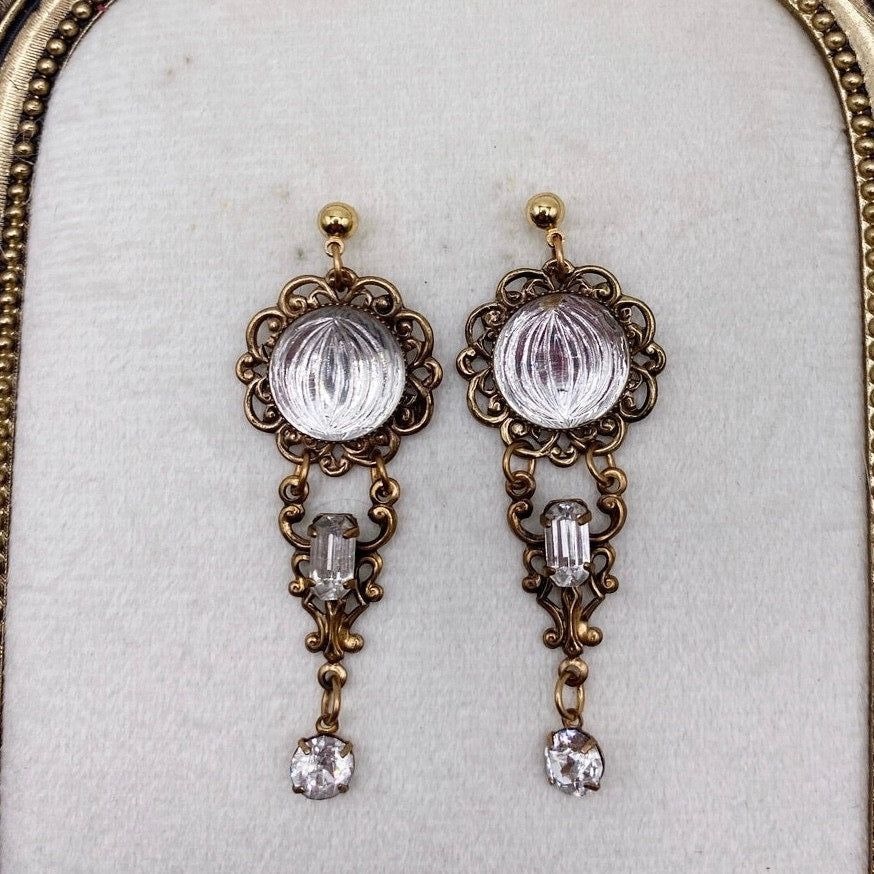 These elegant vintage dangling earrings feature intricate brass filigree craftsmanship, beautifully accented with white rhinestones and glass stones. The airy filigree design creates graceful movement, while the sparkling stones add classic mid-century glamour.