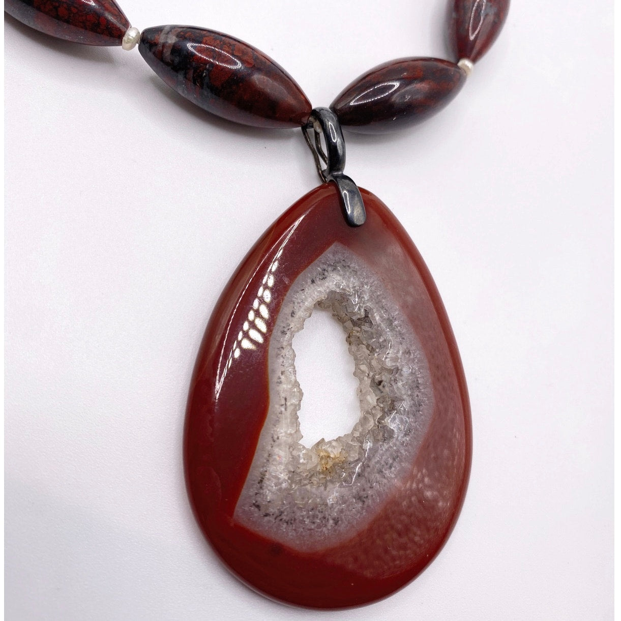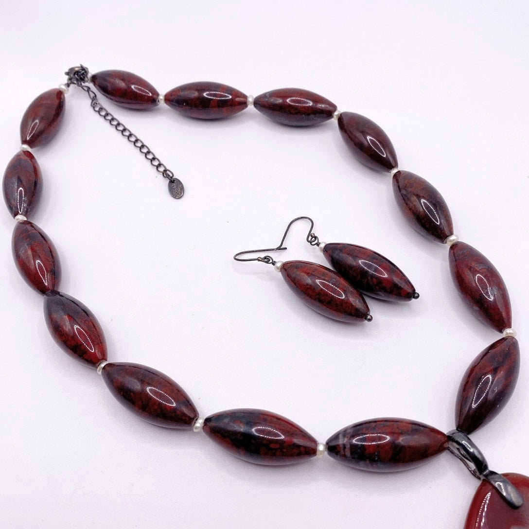 The necklace measures approximately 22 inches, allowing the pendant to sit gracefully at the neckline, while the matching earrings complete the set with balanced color and classic appeal. The deep red hues of agate and carnelian offer a timeless, earthy elegance suitable for both daytime and evening wear.