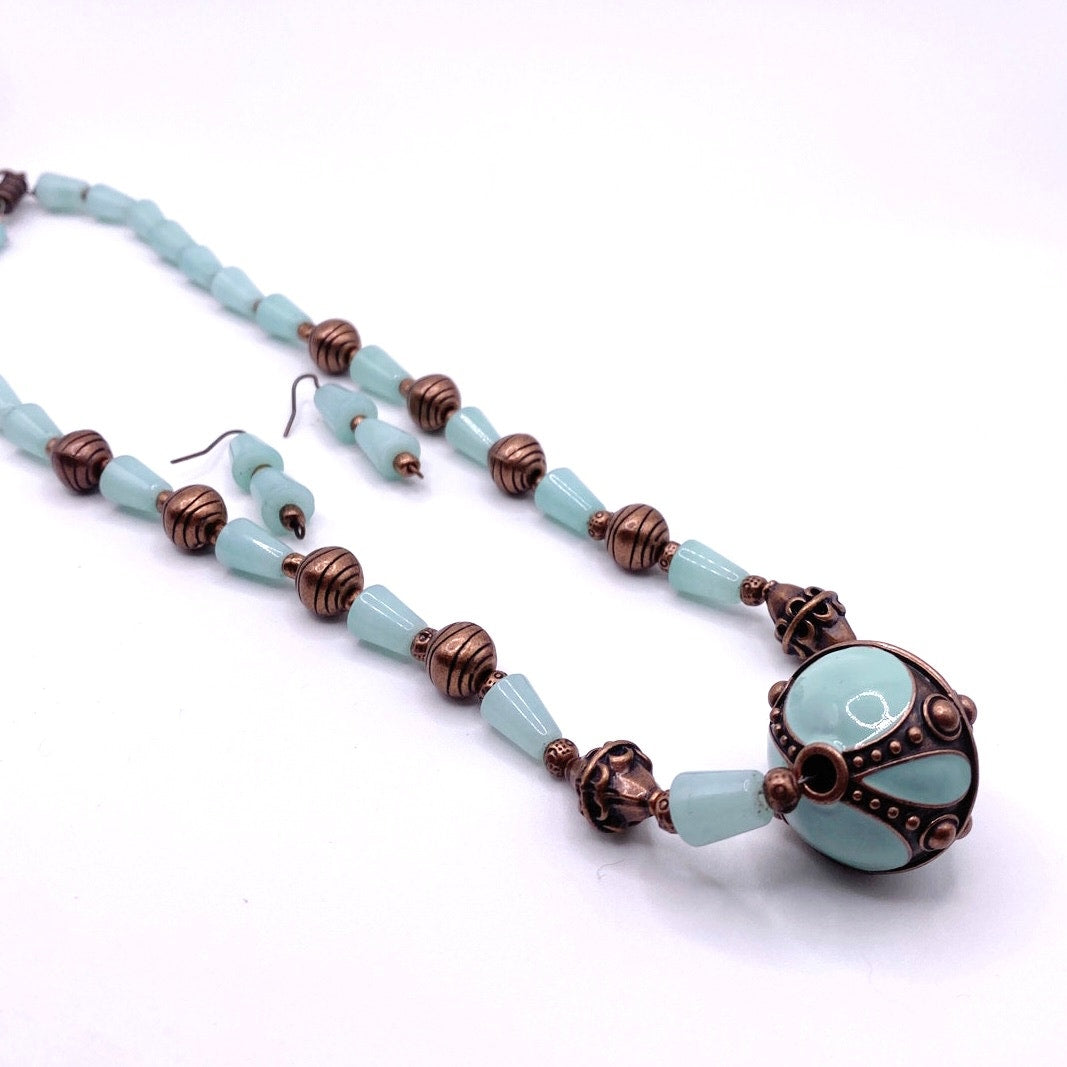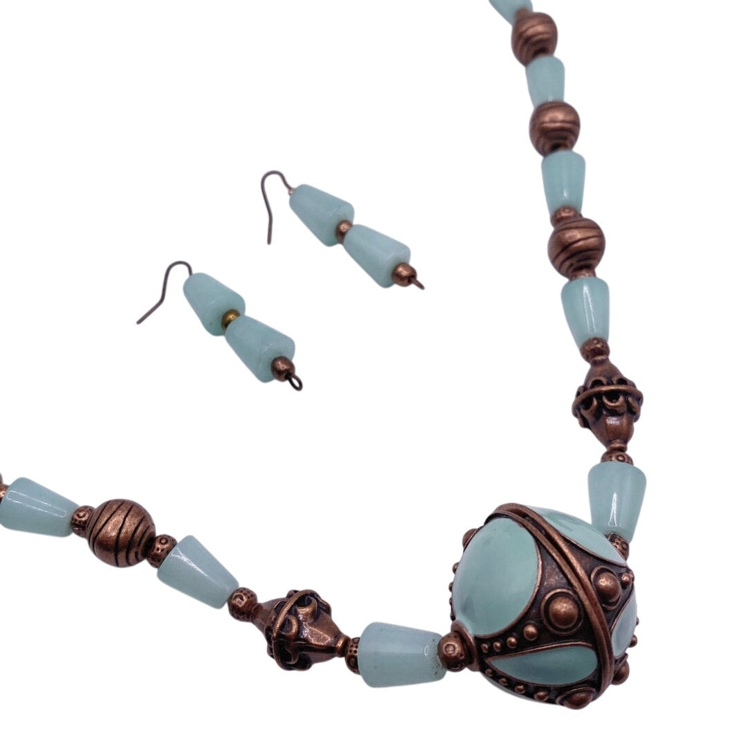 Vntg Handmade Amazonite Gemstones Necklace 18”with Enamel Pendant and Earrings Copper Tone Metal