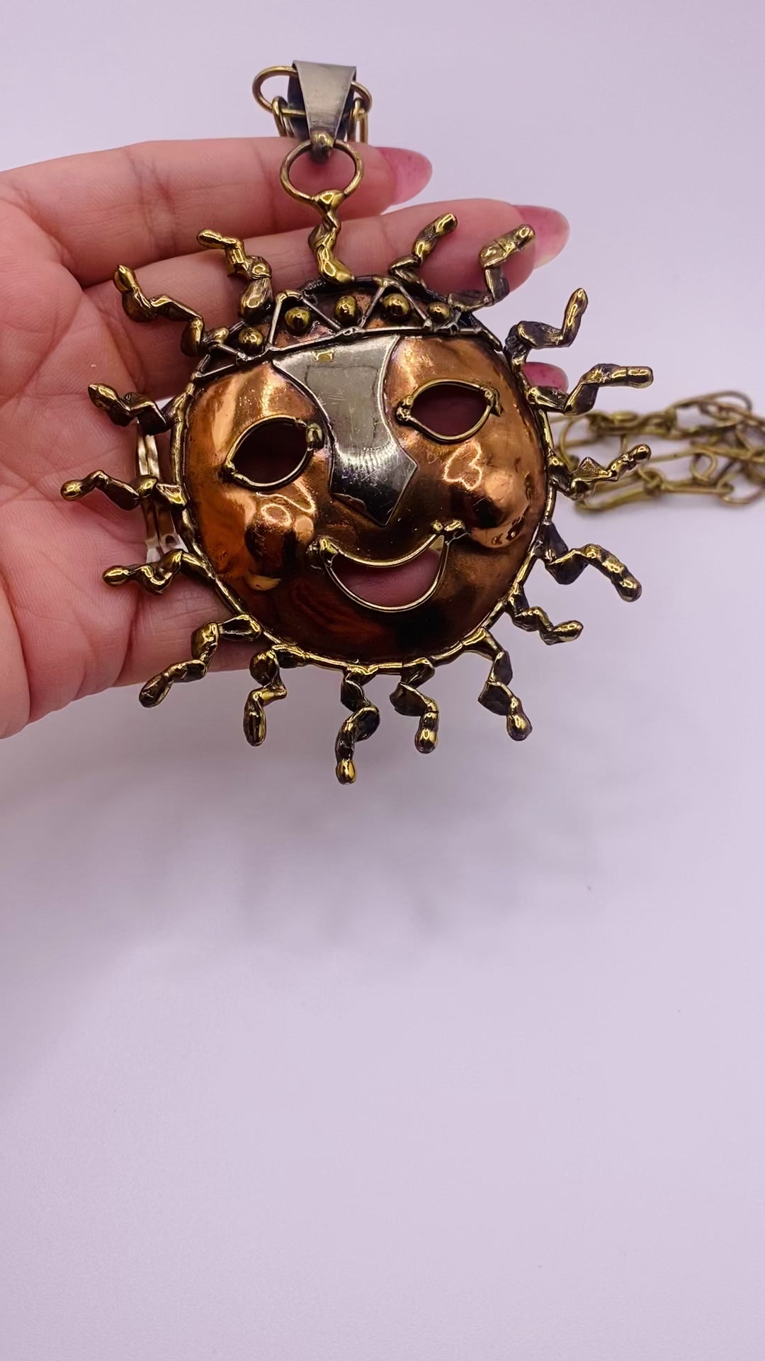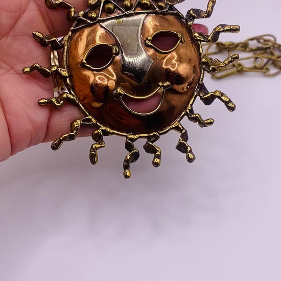 Vintage Artisan Mixed Metal Sun Pendant Necklace – 24” Handmade Smiling Design
