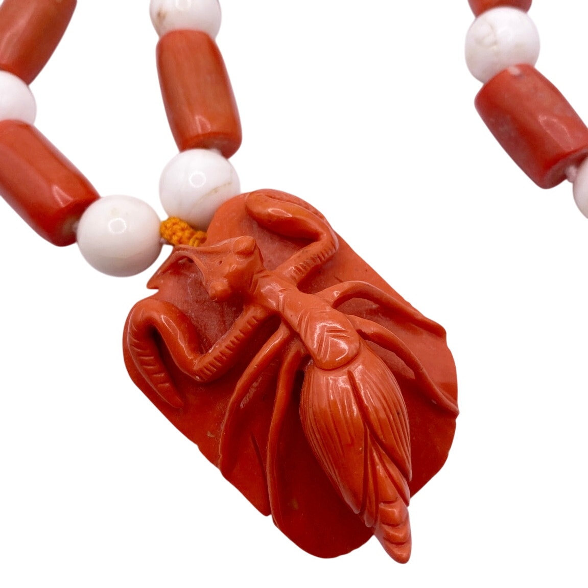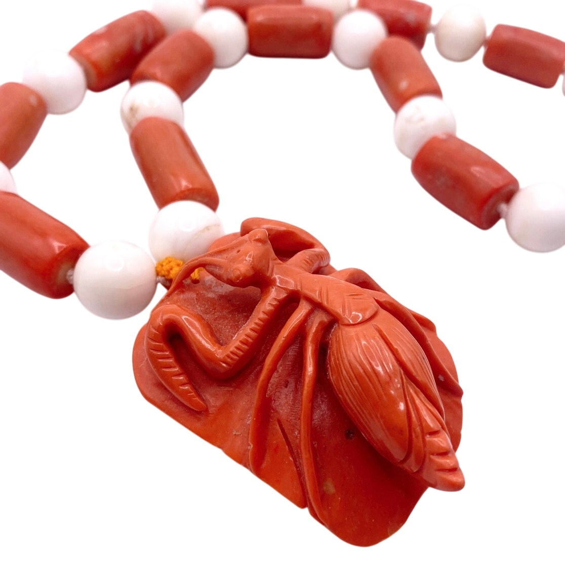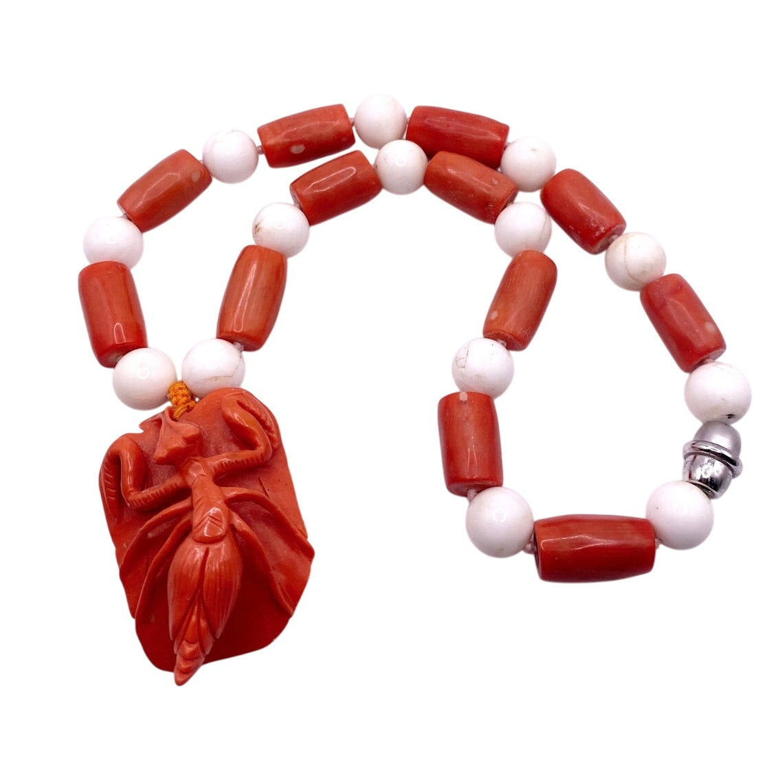 VTG Necklace Salmon Coral And Angel Skin Coral Beads with Carved Insect Pendant 18” and magnetic clasp