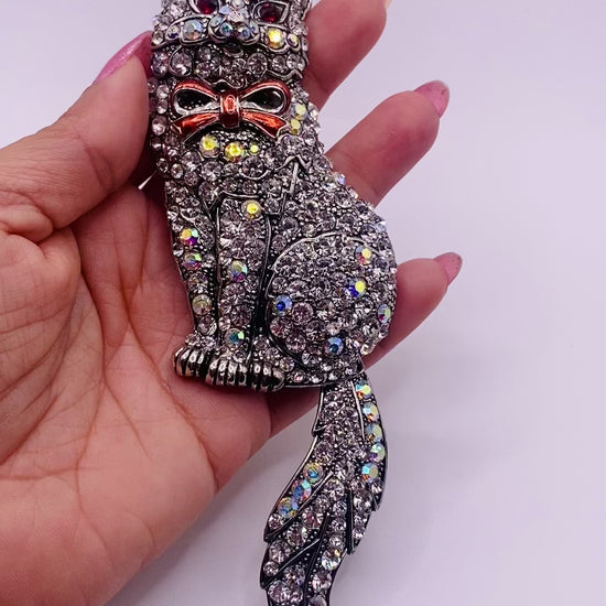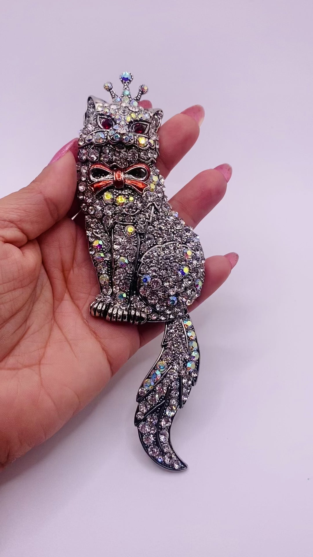 Vintage Rhinestone Cat with Crown Silver Tone Brooch Pin Pendant Swivel Tail 4.5"