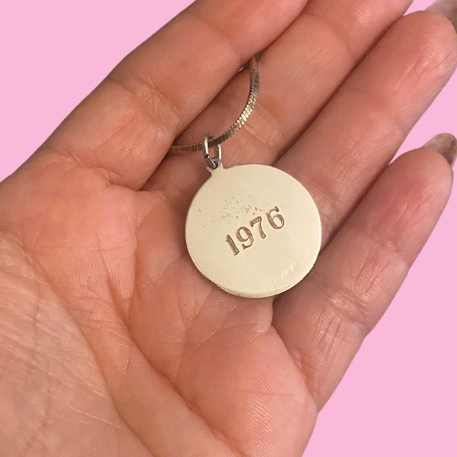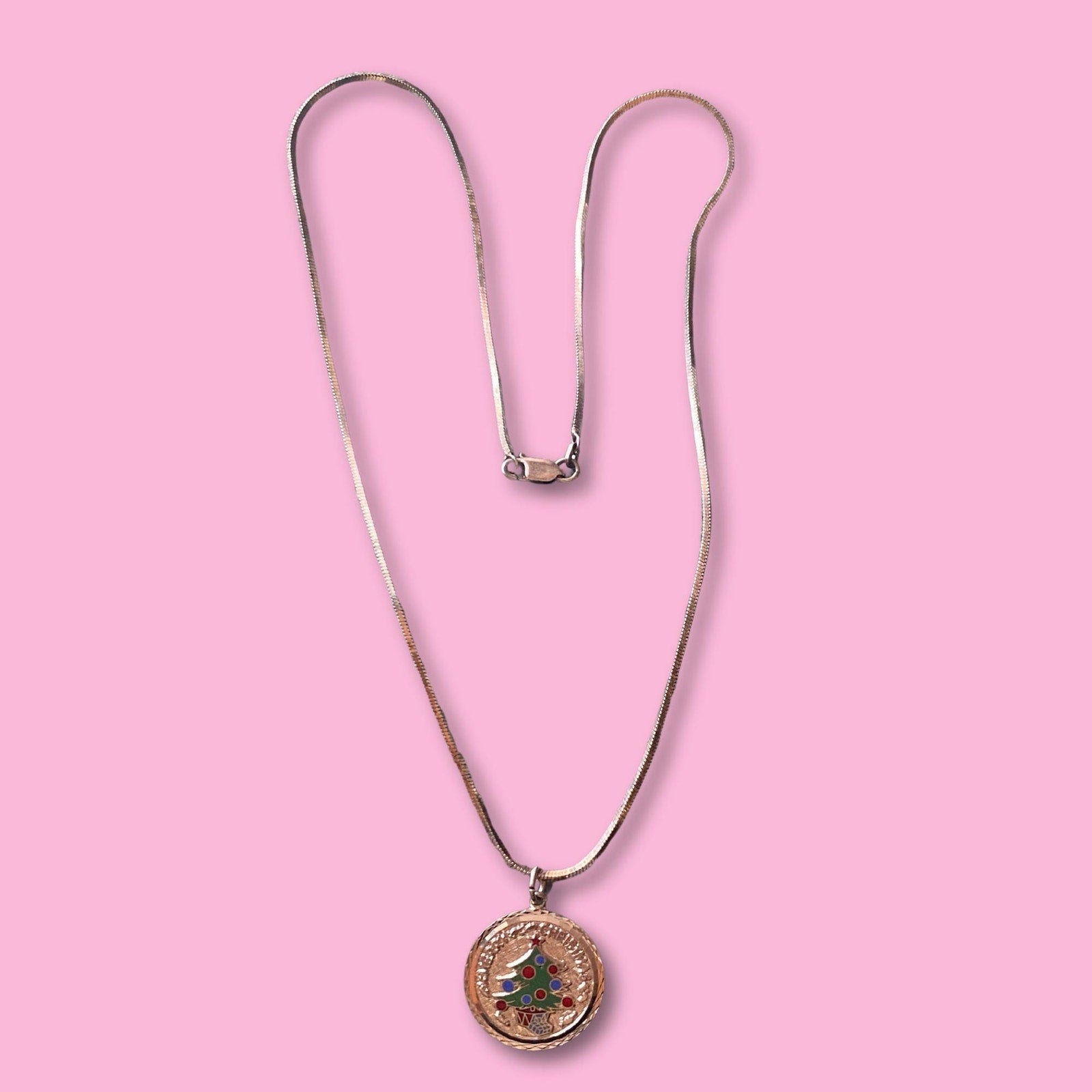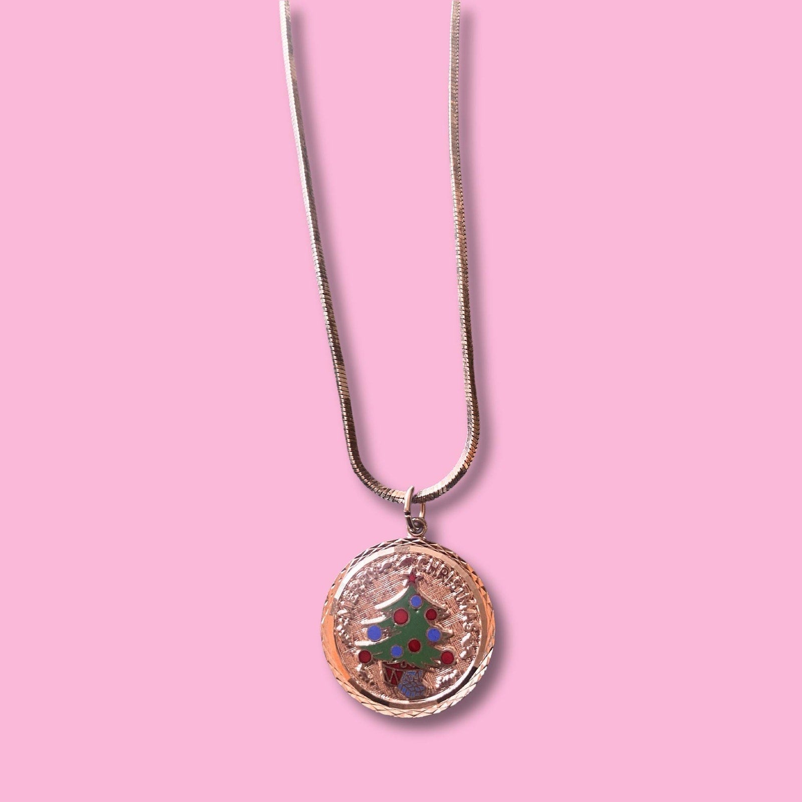*VTG Sterling Silver Cord Necklace with Merry Christmas Medal and Tree it's Signed 1976 on the Back,