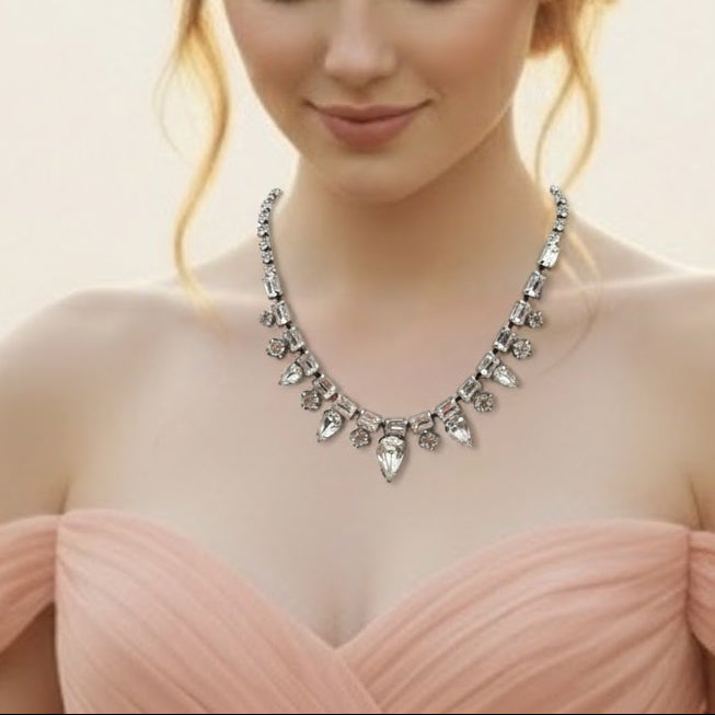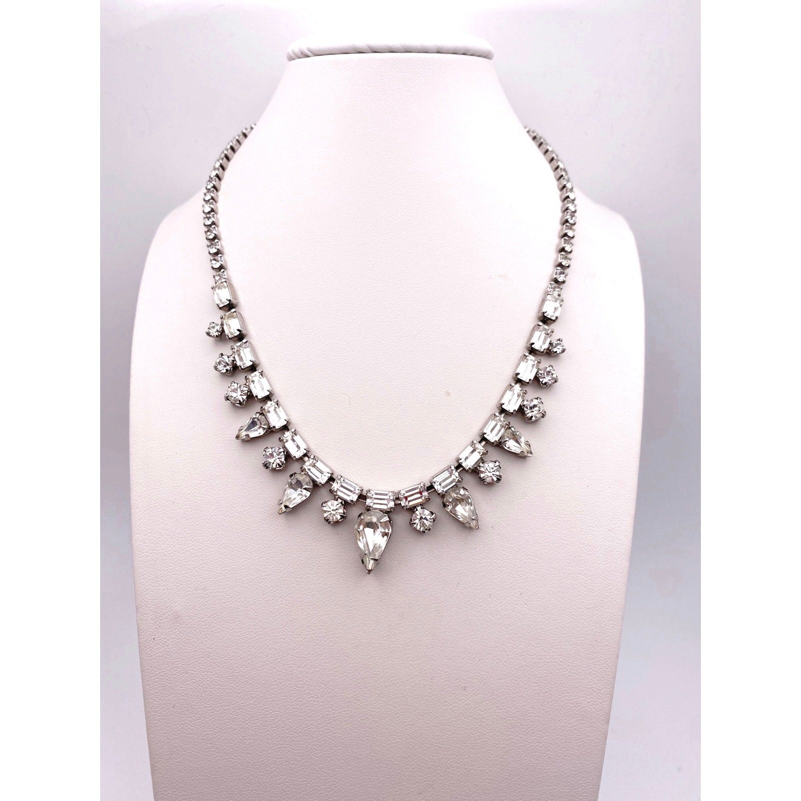 This Weiss signed vintage necklace from the 1950s showcases the brand’s signature sparkle and timeless elegance. Crafted in silver tone metal, it features brilliant clear rhinestones that capture and reflect the light beautifully. Measuring 15 inches, it sits gracefully at the neckline — a perfect accent for evening wear or a vintage-inspired look.